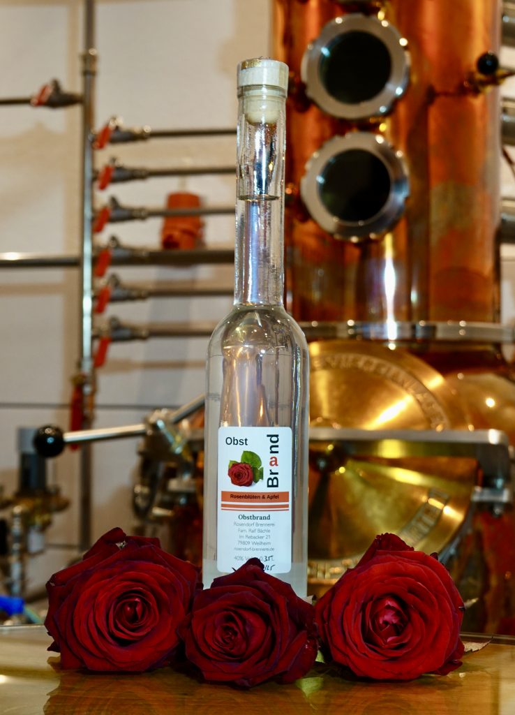 Die Grundlage dieses Rosenblüten & Apfel Obstbrandes ist eine Apfel-Maische die zusammen mit den Rosenblüten der Hansa-Rose destilliert wird. Die Rosenblüten der Hansa-Rose stammen aus dem Rosendorf Nöggenschwiel.